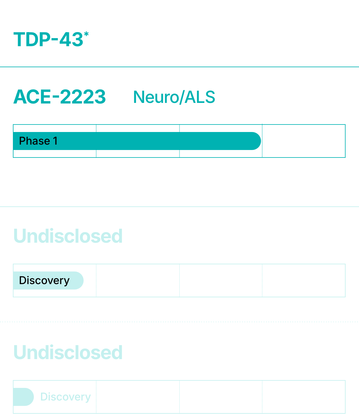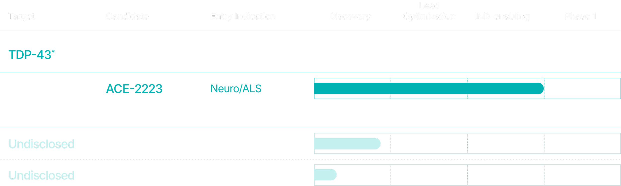 ACE-2223 is a small molecule designed to specifically target misfolded TDP43 that leads to disease pathology.